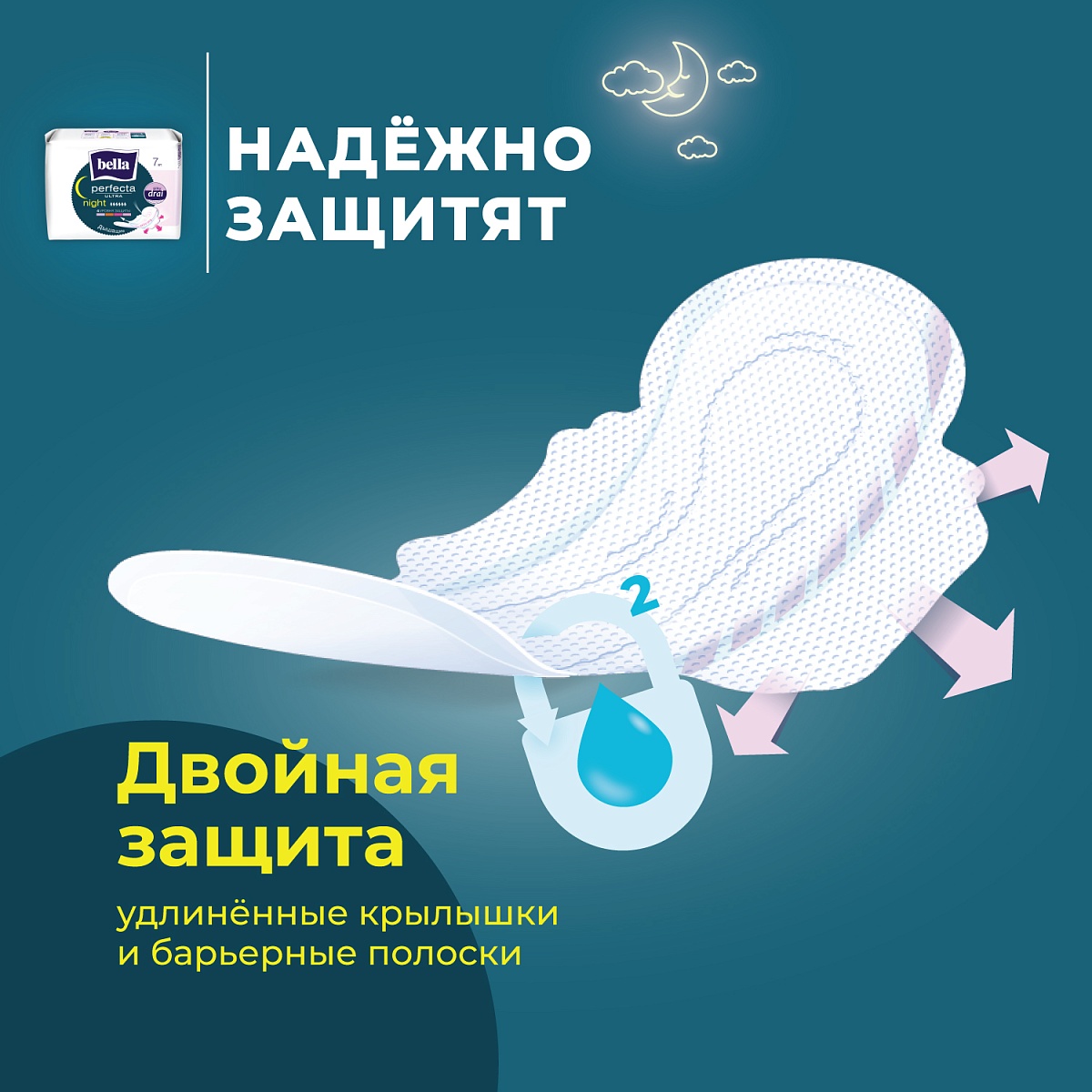 - Надежная фиксация: Удлиненные боковые крылышки, оснащенные тремя клеевыми полосками, обеспечивают превосходную фиксацию к белью и предотвращают смещение прокладки во время сна.